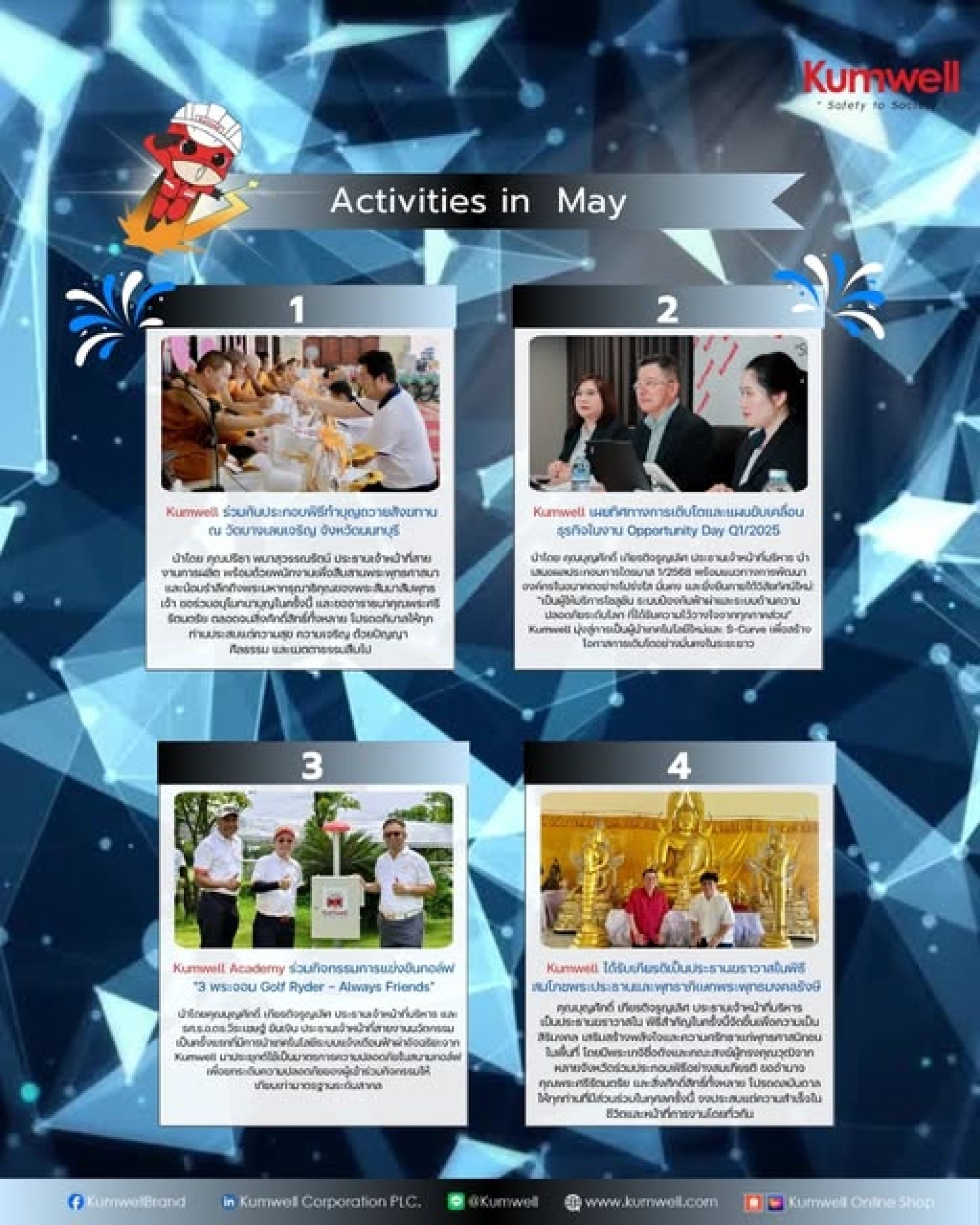 ตลอดเดือนที่ผ่านมา Kumwell ยังคงเดินหน้าขับเคลื่อนความปลอดภัย ทั้งด้านธุรกิจ ชุมชน และสังคม พร้อมร่วมกิจกรรมสำคัญหลากหลาย และเดือนนี้มีอะไรน่าสนใจบ้าง...มาร่วมติดตามกันได้เลยครับ!