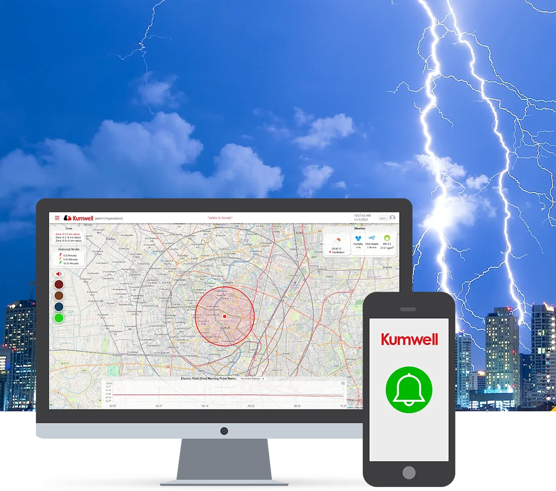 An innovative early warning system that integrates data from two types of IoT sensors: a High-Precision Lightning Detection Network System and localized Electric Field (E-Field) Sensors. By processing this data using AI, the system achieves high performance in accordance with IEC 62793 (TIS 3461-2022) standards, delivering lightning warning accuracy of over 95%.